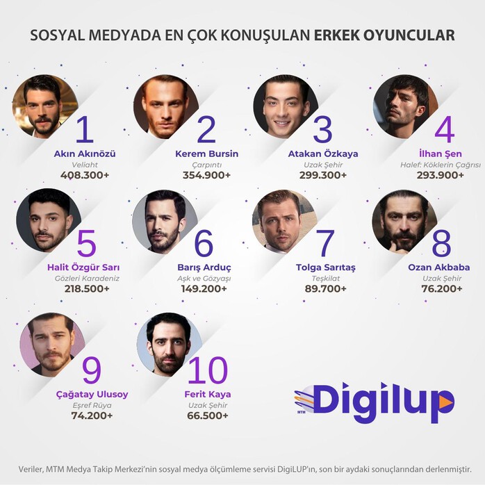 Вчера мы рассказывали вам о десяти самых обсуждаемых актрисах Турции, а сегодня хотим познакомить поближе и с самыми обсуждаемыми актерами-мужчинами. DigiLUP составил свой рейтинг, основной критерий отбора которого заключался в частоте упоминаний имен звезд в соцсетях.
