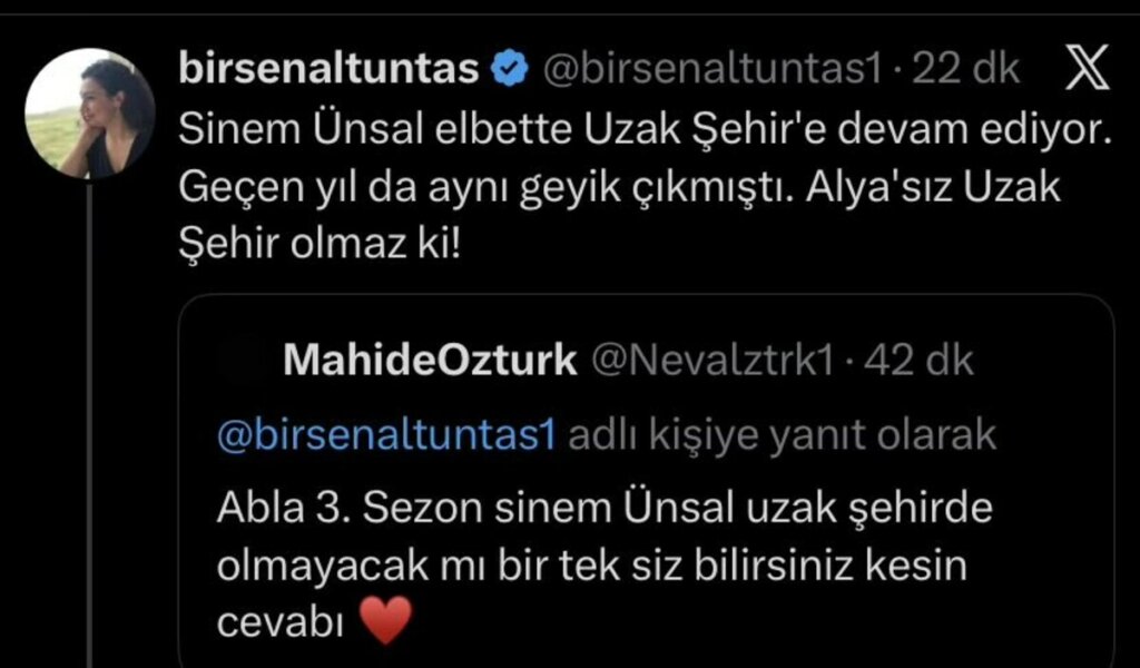 Бирсен Алтунташ высказалась об уходе Синем Унсал из «Далекого города». По словам турецкой журналистки, данные новости абсолютно не соответствуют действительности.