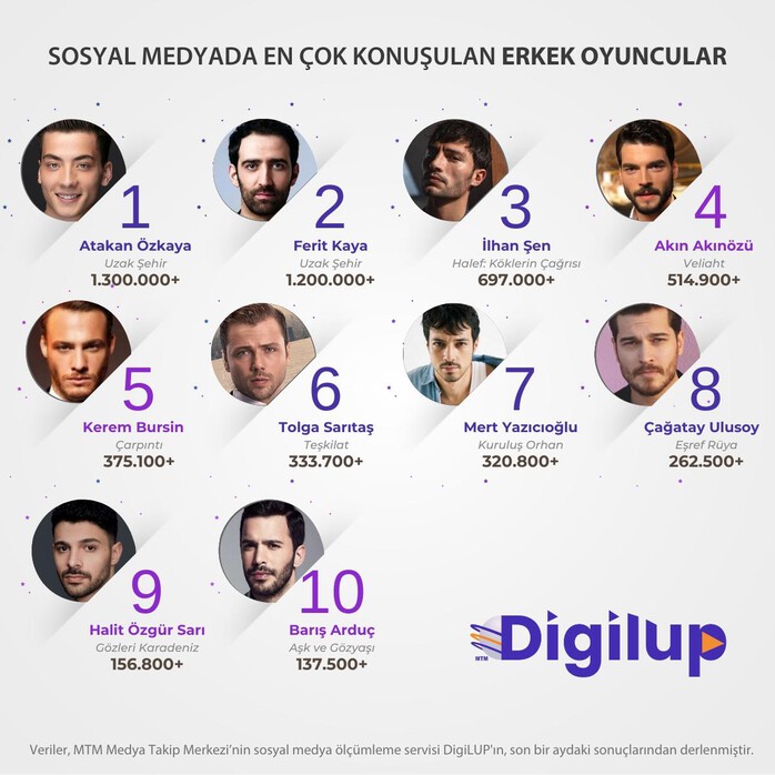 В начале каждого месяца портал DigiLUP составляет свой рейтинг самых популярных и обсуждаемых знаменитостей Турции. И сегодня мы хотим рассказать вам о том, имена каких именно турецких актеров упоминались в соцсетях чаще всего.