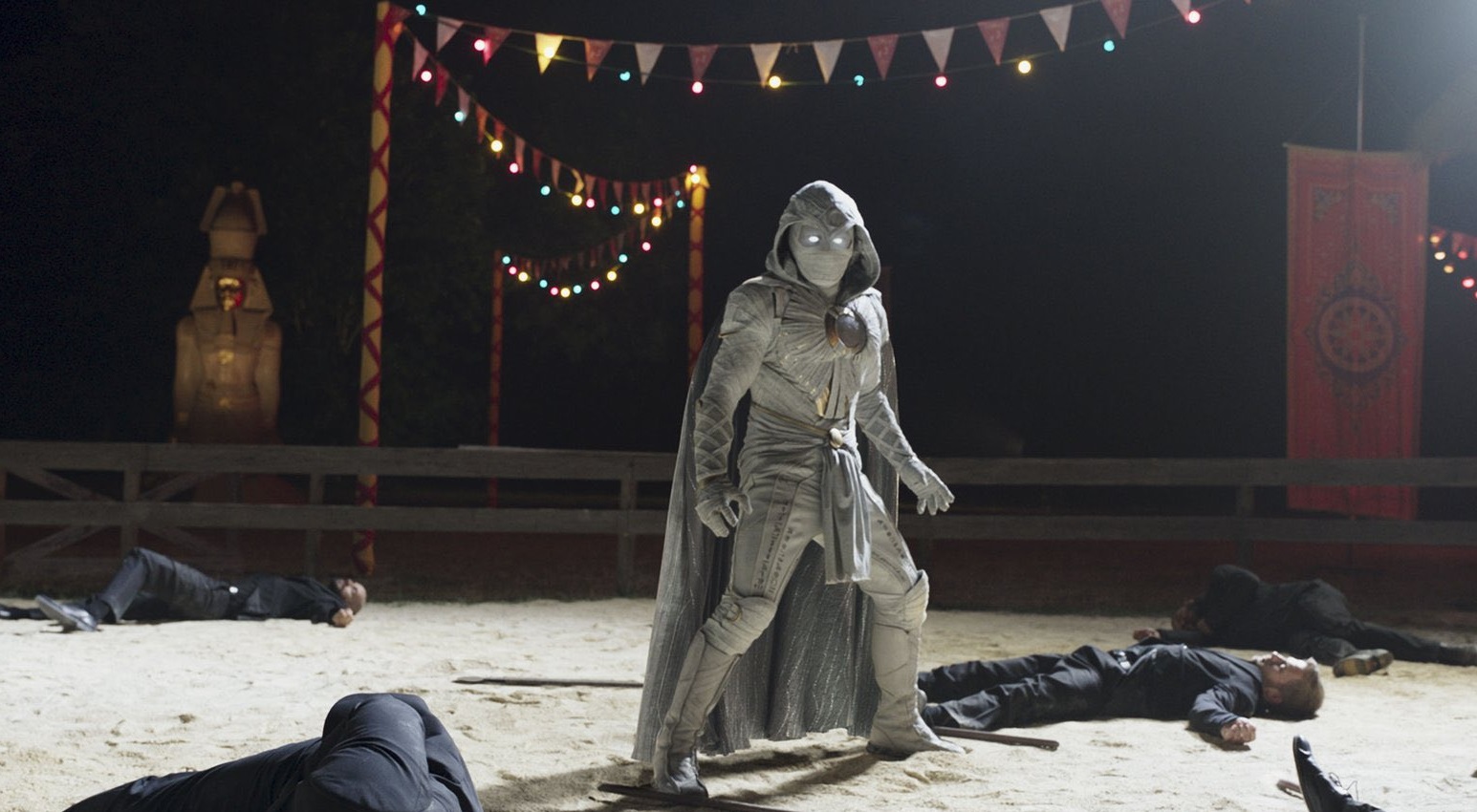 Также в Сети появились постер и кадр из шоу, на котором можно увидеть Лунного рыцаря в новом образе: в деловом костюме, маске и с тростью. Он основан на одном из воплощении персонажа в комиксах — Мистере Рыцаре.
