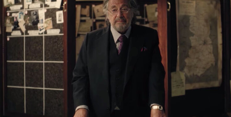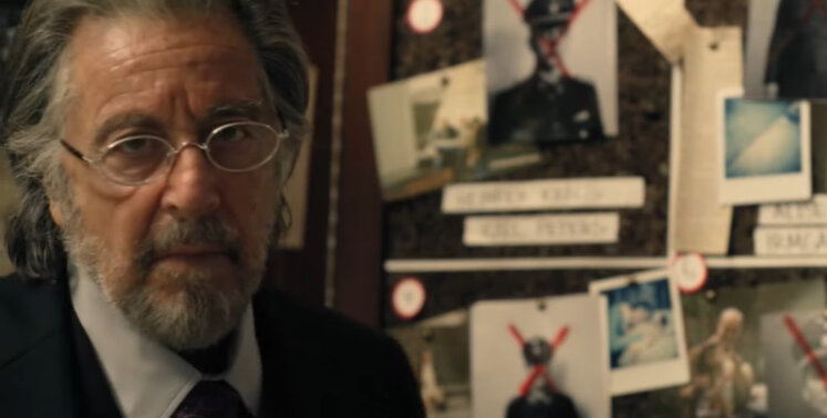 Первый тизер сериала, который вышел в октябре 2019-го, невероятно короткий. Мы видим, как Пачино вычеркивает чье-то лицо — предположительно, нациста — на доске с красным маркером. Мы видим двух неизвестных женщин, сражающихся друг с другом. Одна женщина кричит, когда ее приковывают наручниками к стулу. Мы видим, как взорван автомобиль; мы видим, как мужскую руку ударили ножом.