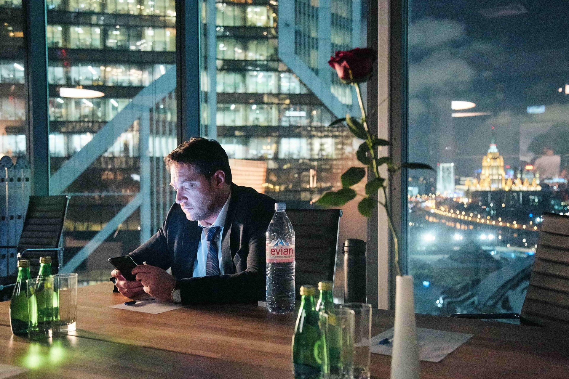 - Основная часть съемок проходила без декораций, основной локацией послужил деловой центр «Москва-Сити». Башни центра видны из панорамных окон одного из офисов, в котором происходят основные события.