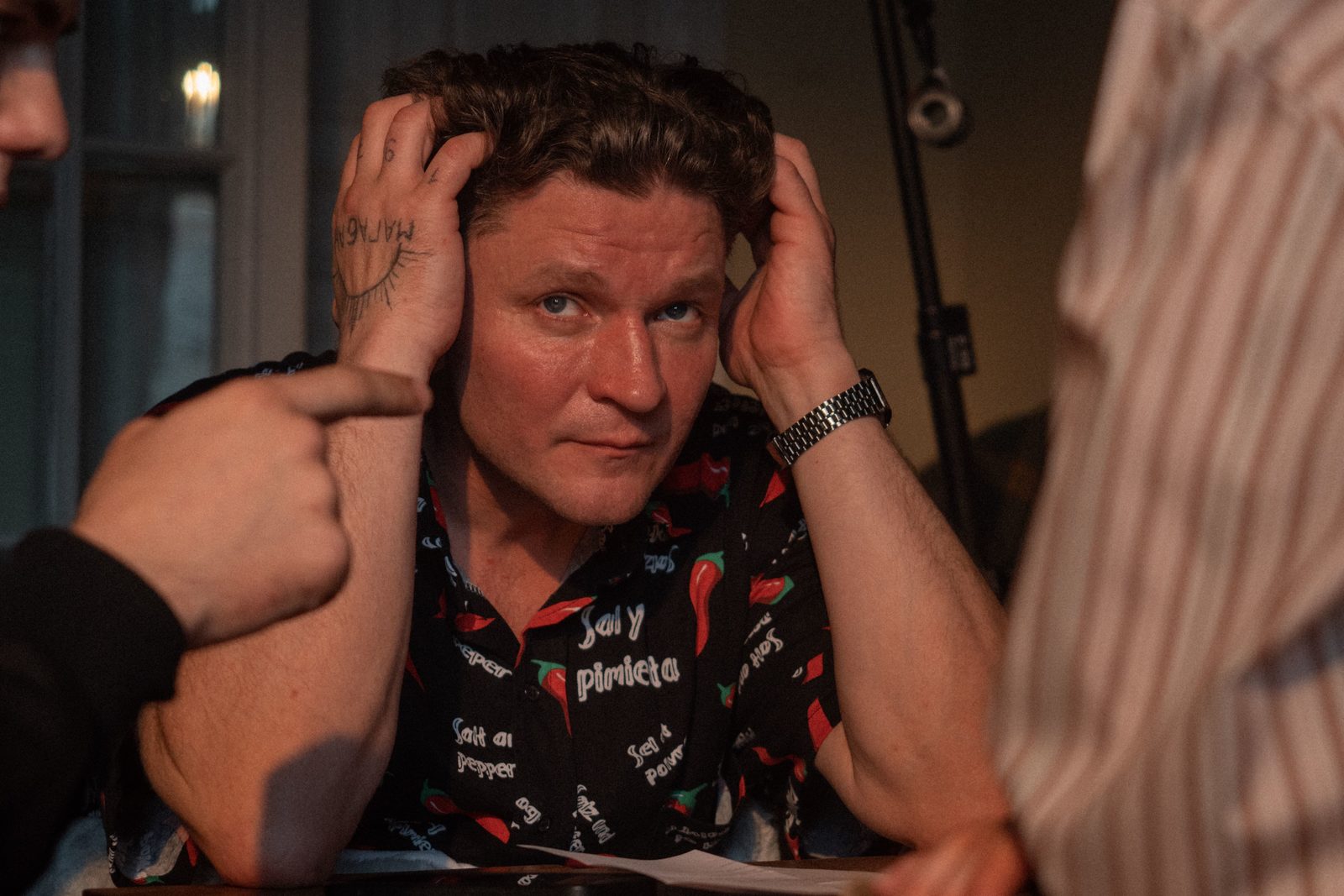 «Мы стремимся к особой подаче игры актеров – гротесковой, специфичной и, надеюсь, нам это удается. Работа идет непросто: в вирусный период почти вся группа переболела. Мы постоянно что-то придумываем – разыгрываем сцены иначе, сокращаем или добавляем детали, отходим от сценария ради живой истории. Два московских актера, играющих полицейских, практически весь фильм оставались с красными лицами. По сценарию они должны были стереть краску в середине картины. Но мы решили, что герои так и не смогли избавиться от родамина и остались «краснокожими» до конца».