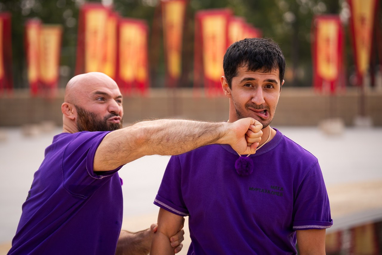 - Фиолетовая команда: комик Магомед Муртазаалиев и боец Магомед Исмаилов.