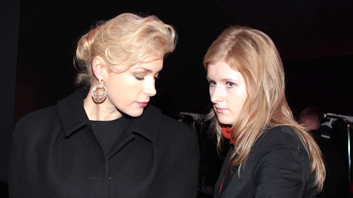 Теледива в ответ пощупала бицепсы гостьи и похвалила ее татуировку во всю спину. А также отметила длинные ноги в ботфортах.