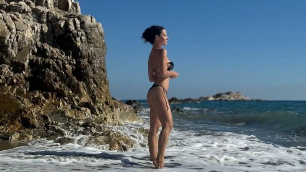 Черный раздельный купальник подчеркнул стройную фигуру актрисы, а виды, на фоне которых она позирует, действительно завораживают.