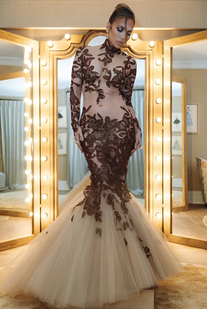 Дженнифер Лопес выбрала для выхода в свет необычный образ: почти прозрачное обтягивающее платье с узорами, которые прикрыли все «пикантные» места. Узкое платье кроя «русалка» завершалось пышной юбкой от колена. Волосы 56-летняя Джей Ло собрала в пучок, оставив на лице элегантную прядь, дополнив образ бриллиантовыми серьгами, клатчем в тон и несколькими кольцами.