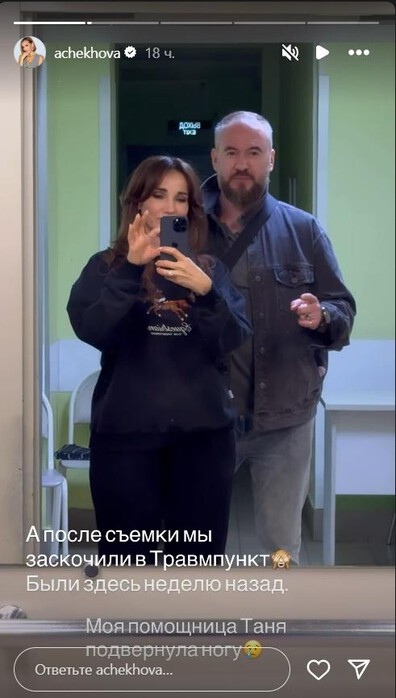 47-летняя женщина рассказала, что второй раз за неделю она с возлюбленным Александром Златопольским приехала в травмпункт. В первый раз они привозили сюда сына Чеховой, который упал с велосипеда и повредил ногу. А теперь печальная участь постигла их домработницу.