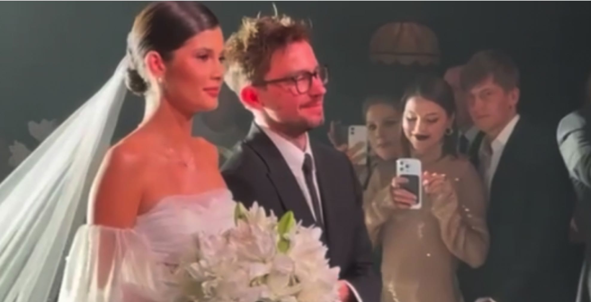 На невесте было прозрачное белое платье с открытыми плечами и длинной фатой. Жена актера не стала надевать нижнее белье. 22-летняя избранница звезды выглядела очень сосредоточенной.