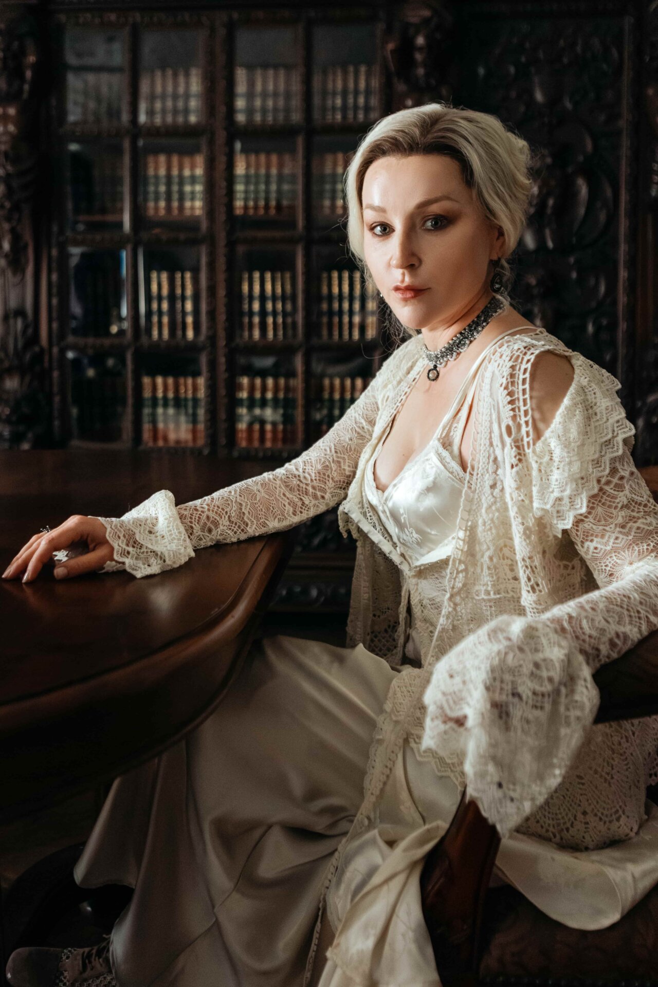 Властная 500-летняя Госпожа (Евгения Дмитриева) немногословна, жестока и любит играть на фортепиано. Она дворянка до мозга костей и главная хранительница традиций в уральской общине. Ее волосы уложены роковыми волнами в стиле начала XX века — в технике ондуляции. Специальный парик платиновой блондинки укладывали отваром льняного семени — средством, широко используемым в начале XX века.