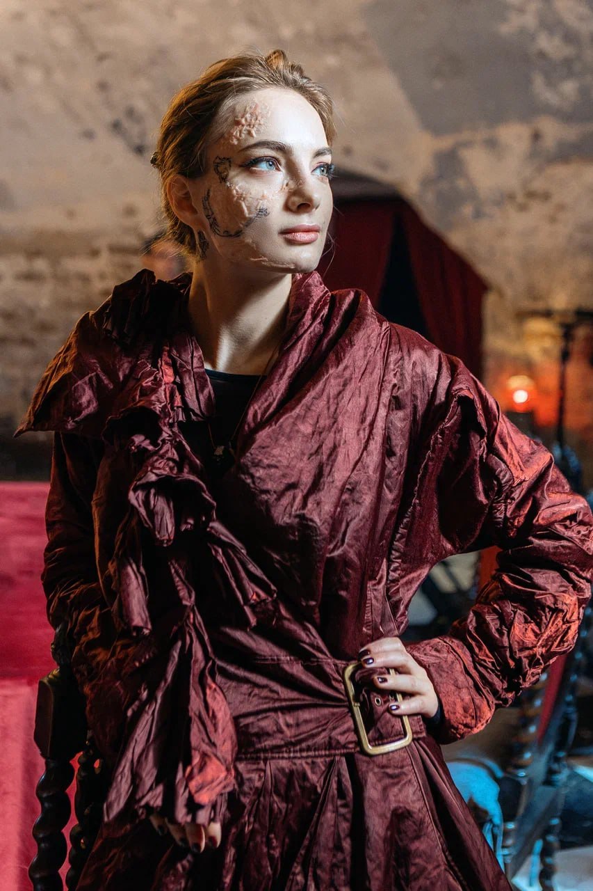 Экранной сестре Антона достался чуть более сдержанный образ, но Марии Лисовой все равно придется провести немало времени в кресле гримера: половину ее лица занимает шрам от ожога — ведь когда-то Мию брат спас от сжигания на костре.
