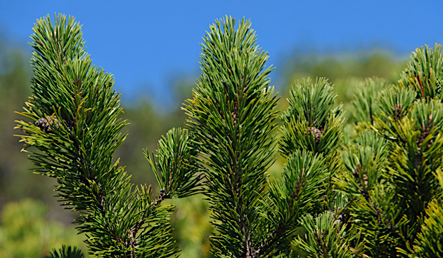 Пумилио (Pinus mugo var. pumilio). Это природная разновидность, которую можно встретить в Альпах и Карпатах. Там она растет в виде кустарника высотой до 1 м и диаметром до 3 м. Ветки у нее разной длины и направлены они вверх. Иголки обычно короткие. Шишки в первый год меняют цвет от голубого до фиолетового, но по мере созревания они желтеют, а затем становятся темно-коричневыми.
