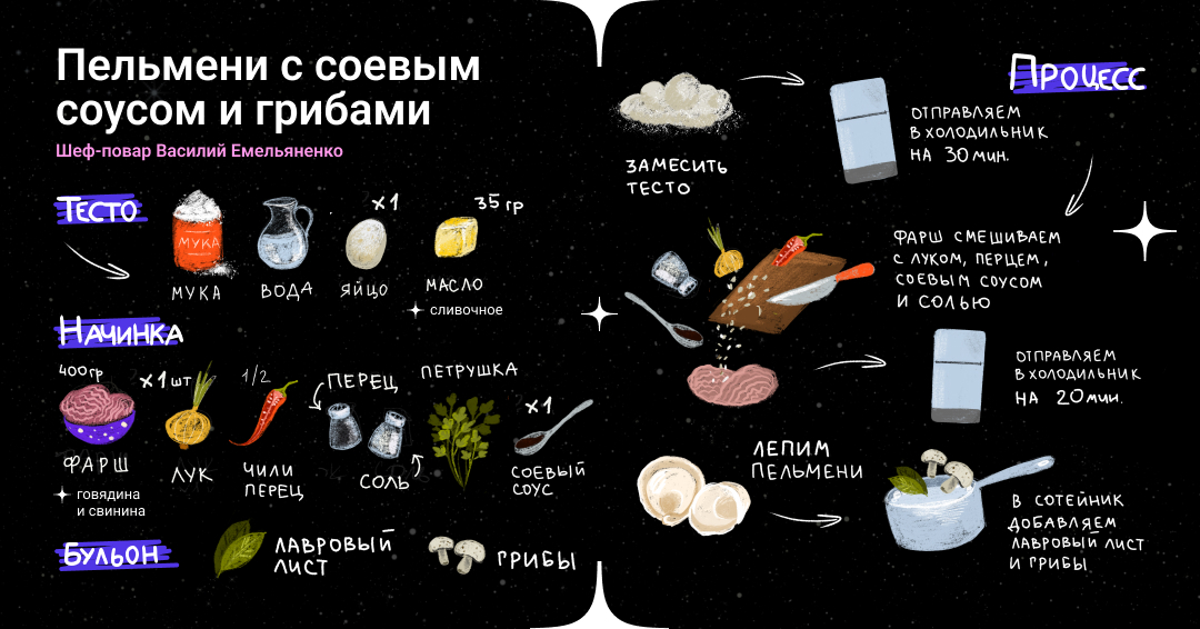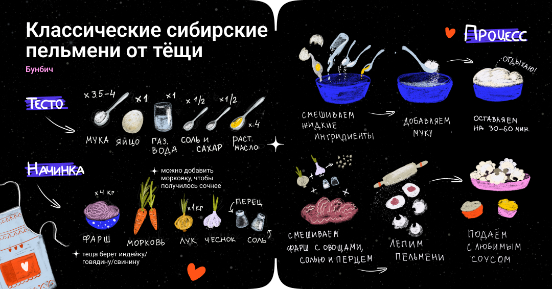 «В семье моей тещи каждый год лепили тысячи пельменей, — рассказывает Бунбич. — А потом с ними готовили самые разные блюда, даже суп. Теперь же у нее есть своя традиция: лепить перед Новым годом ровно тысячу пельмешек, один из которых — обязательно с начинкой из теста вместо фарша. Тот, кому попадется этот пельмень, может загадать желание».