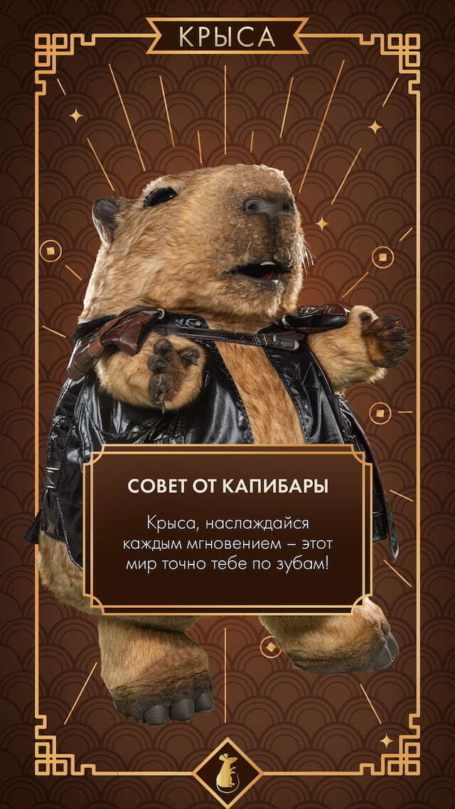 Шустрые Крысы, год будет непростым. Но рано пищать и опускать вибриссы — твоя хитрость и сообразительность, как всегда, придут на помощь на пути к успеху, главное — не забывай о вкусных перекусах (кусочек сыра всегда должен быть под лапой). Но если и сыр не помогает, то делай как я — просто сиди в воде, поглаживай пузико и притворяйся, что всё в шоколаде (в конце концов — кто, если не ты, лучше всех находит выход из любого лабиринта?).