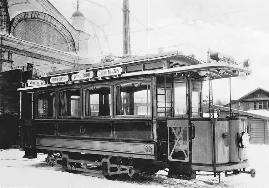 Следующее большое событие в истории трамвая — запуск в 1899 году первой линии электрического трамвая. Он ходил от Масловки до Петровского парка. Затем маршрут продлили до Тверской заставы. По тем временам скорость у электрического трамвая была просто фантастическая — до 25 километров в час. Модели приехали в Москву из-за границы — западногерманские вагоны фирмы «Фалькенрид». Вагоны деревянные и узкие — всего 2,2 метра. Сиденья размещались вдоль салона.