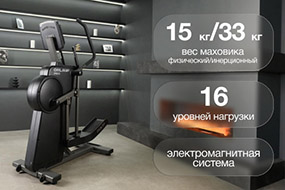 Плавный ход — заслуга одного из самых тяжелых в своем классе маховиков: его физический вес составляет 15 кг, а инерционный достигает 33 кг. По уровню нагрузки тренажер не уступает профессиональным эллипсоидам из фитнес-клубов.