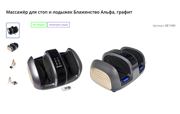 Массажер «Блаженство» разминает стопы с помощью вращающихся валиков. У него четыре режима интенсивности, а размеры углублений для ног позволяют массировать не только стопы, но и голени. Прибор автоматически отключается после 15 минут работы. Массажер для удобства использования имеет пульт дистанционного управления.