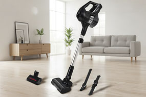 Отличием данной модели является объемный контейнер для сбора пыли: в него поместится 1,5 л. Вертикальный пылесос подходит для ежедневной и генеральной уборки. Пылесос работает от аккумулятора емкостью 2,5 А·ч, этого хватит на 45 минут автономной работы. В комплекте поставляется несколько насадок разных типов.