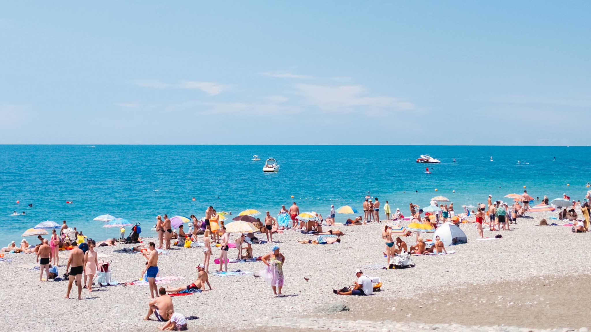 На исходе лета на всех курортах Большого Сочи солнечно и жарко. Средняя температура воздуха +28…+29°С. Днем солнце палит так сильно, что курортники предпочитают проводить время в кафе, отелях или тенистых парках. По ночам становится полегче — +19…+20°С.
