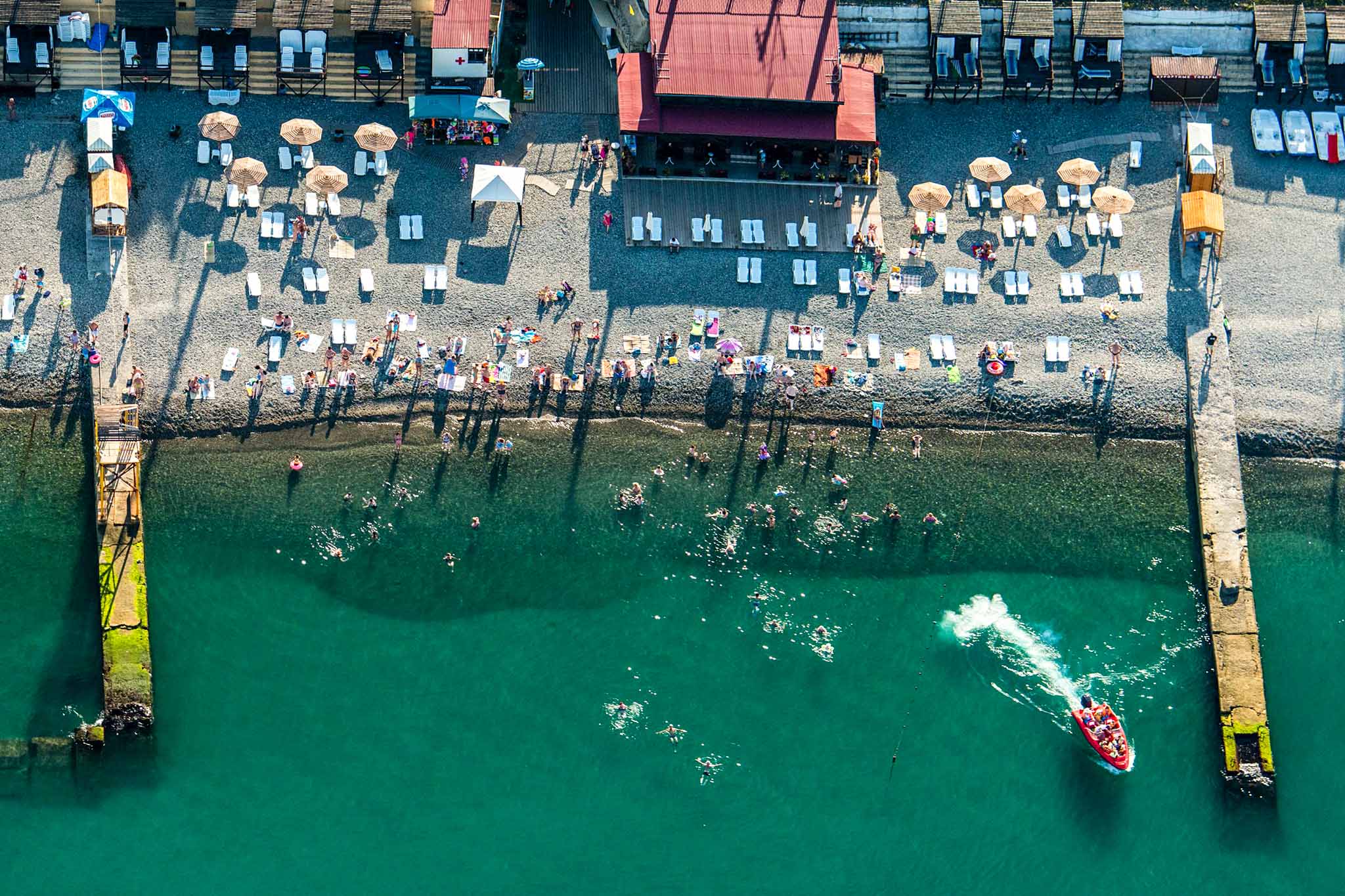 В мае начинается пляжный сезон, который длится до октября. Почти все адлерское побережье галечное, есть пляжи платные и бесплатные, дикие и с хорошей инфраструктурой.