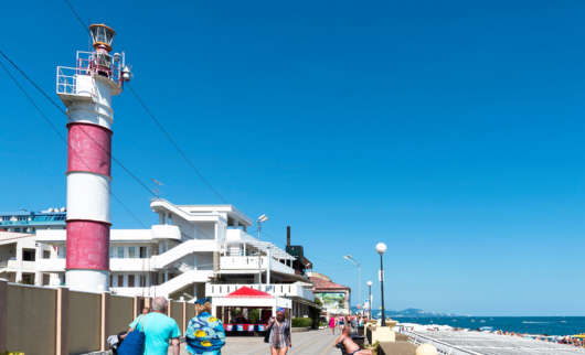 Адлерский маяк идеально подойдет в качестве объекта для красивых снимков или точки для романтического маршрута. Он находится на пляже «Чайка», недалеко от санатория «Южное взморье». Это район аэропорта, специально туда не поедешь, но если вы поселились неподалеку или отправились погулять в адлерский парк культуры и отдыха (он тоже совсем рядом), дойдите и до маяка. Тем более, что набережную, которая отделяет его от моря, отлично благоустроили, заполнили кафе и небольшими магазинами.