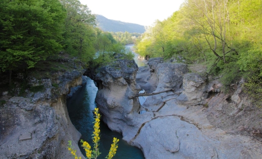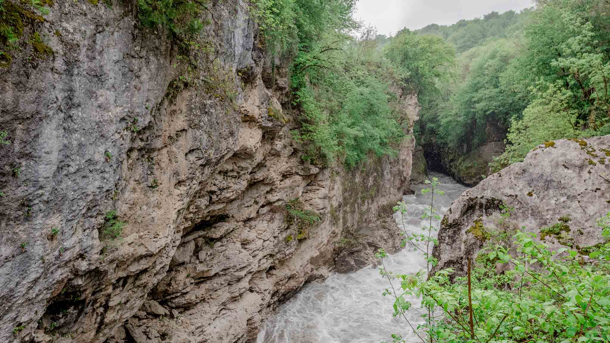 Река в начале ущелья течет спокойно, но в узких местах начинает шуметь. Раньше на радость туристам с каменного моста через Белую прыгала местная молодежь, но сейчас никто не купается.