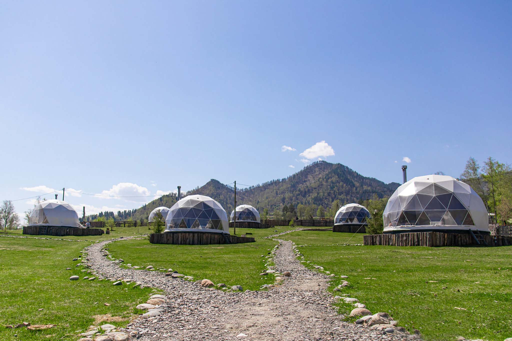 Гости могут жить в купольных домах с панорамным видом на снежные вершины Северо-Чуйского хребта или в лесных шатрах на берегу горной реки Актру. Туалет и умывальник находятся внутри дома, душ расположен на территории комплекса. Питание (на территории есть кафе), баня и экскурсии оплачиваются отдельно.