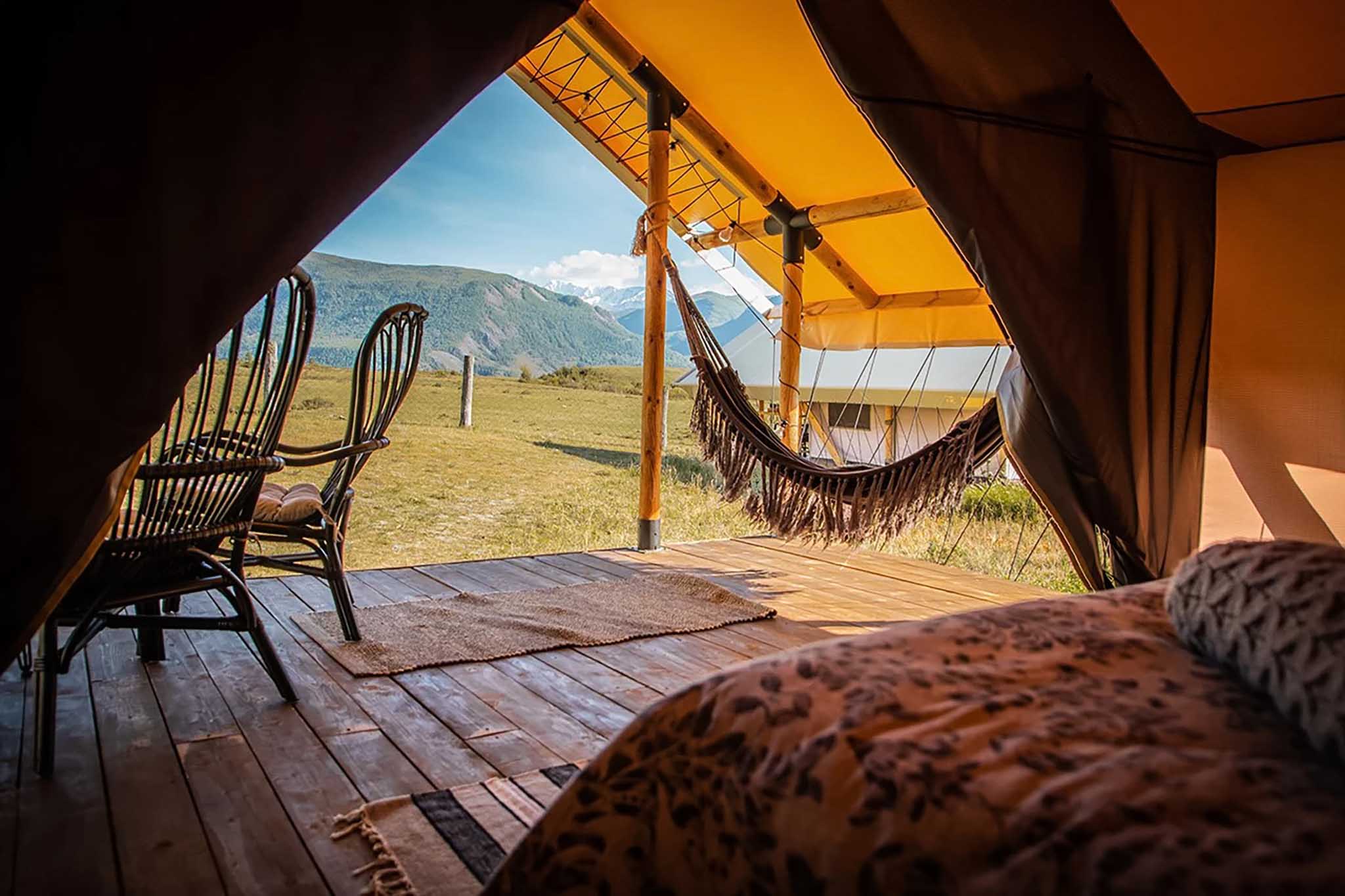 Территория глэмпинга расположена на холмистом берегу горной реки, а сафари-тенты подняты от земли на 2,5–3 метра. Сюда не советуют приезжать с детьми младше 7 лет.