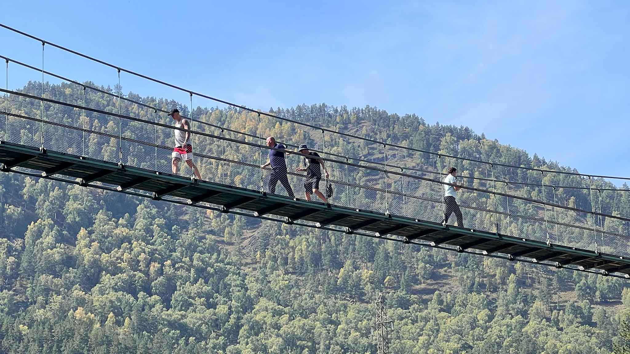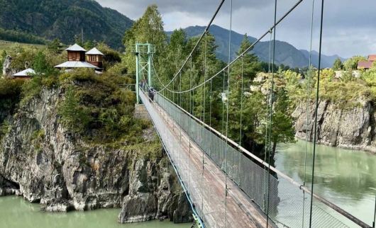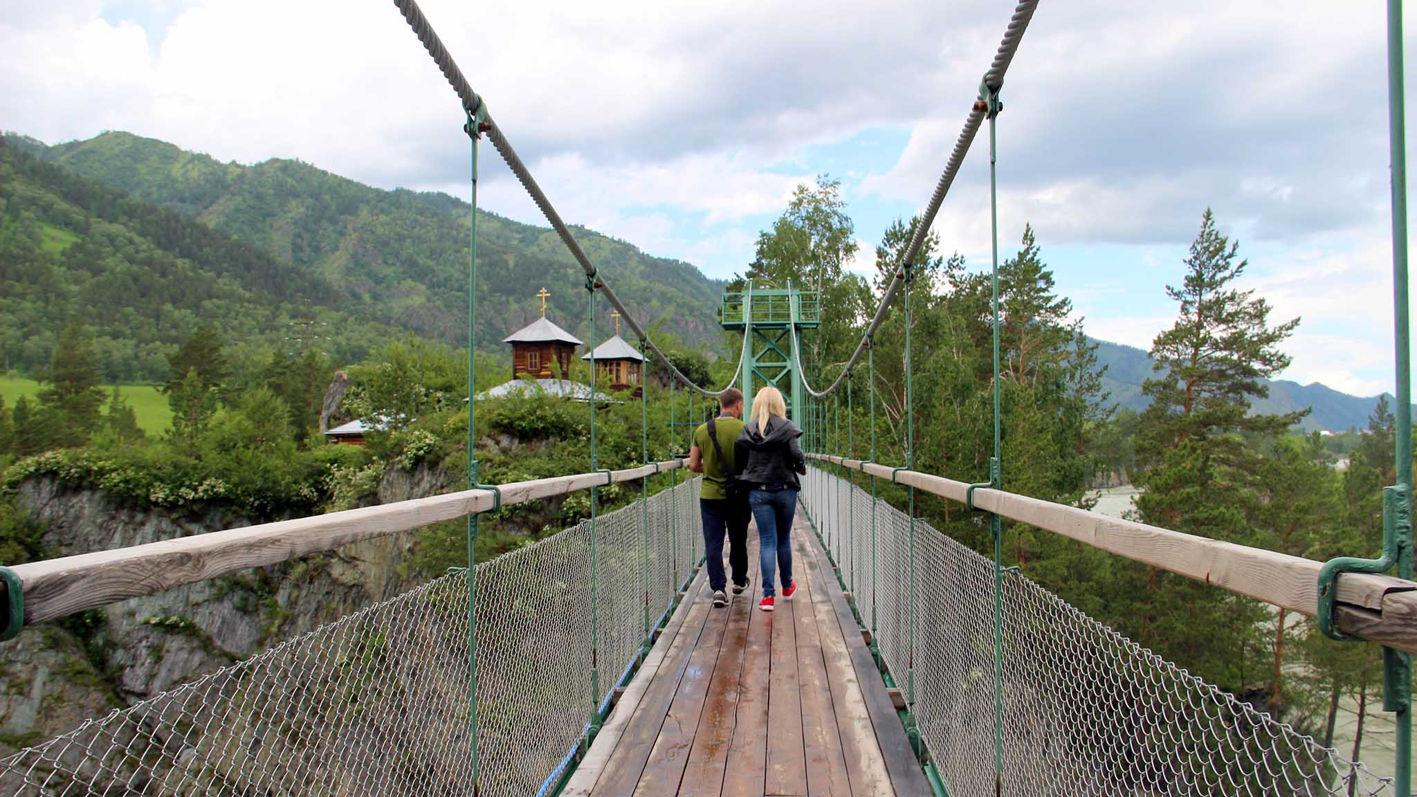 Первым делом предстоит преодолеть подвесной мост — это единственный путь на остров. Пешеходная переправа длиной около 1 километра находится на высоте 15 метров. При прохождении мост может раскачиваться, поэтому пройти по нему решаются не все. Зато по пути открываются красивые виды на реку Катунь и сам остров Патмос. Мост безопасен и оборудован перилами, стальными тросами и защитной сеткой.