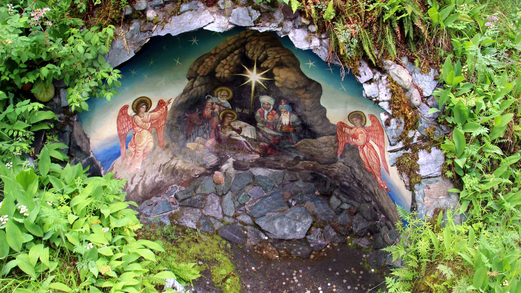 Уже с моста открывается вид на высеченный в скале образ Богородицы с младенцем. Идея его создания принадлежит монахиням Знаменского женского монастыря. Настоятельница Наталья однажды увидела в куске скалы образ Божией Матери, а одна из монахинь — Филофея (Лобанова), бывшая в миру профессиональным скульптором, доработала камень, придав ему законченный образ. Она же потрудилась над небольшим скальным гротом, в котором написан рождественский сюжет поклонения волхвов.