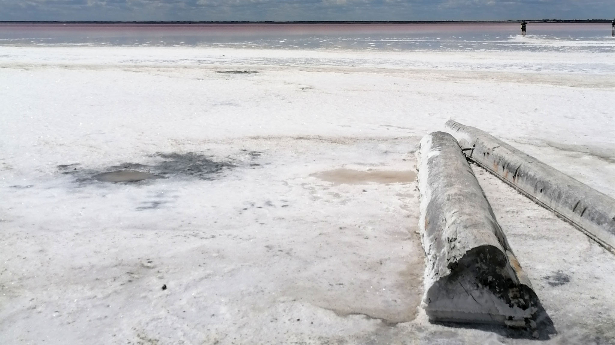 На озере есть практически утопленные рельсы. Их можно даже не заметить, пока по воде не поедет поезд — несколько раз в день он перевозит соль.