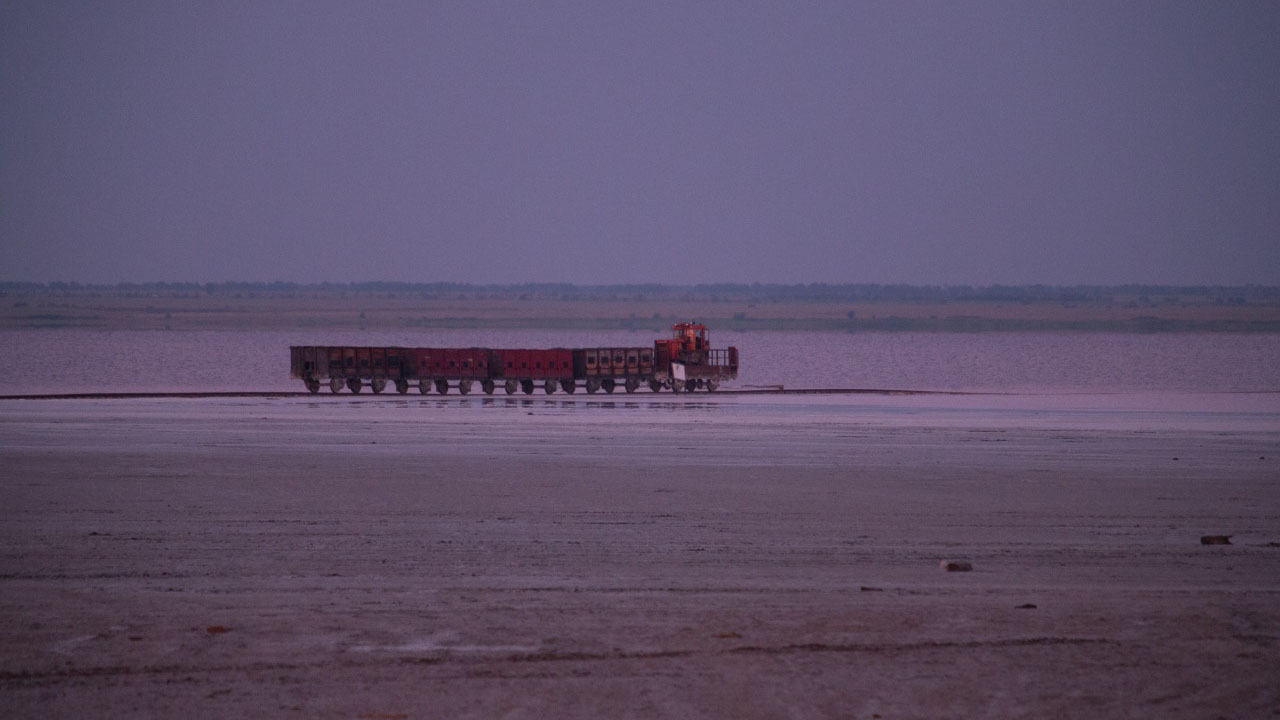 На озере есть практически утопленные рельсы. Их можно даже не заметить, пока по воде не поедет поезд — несколько раз в день он перевозит соль.