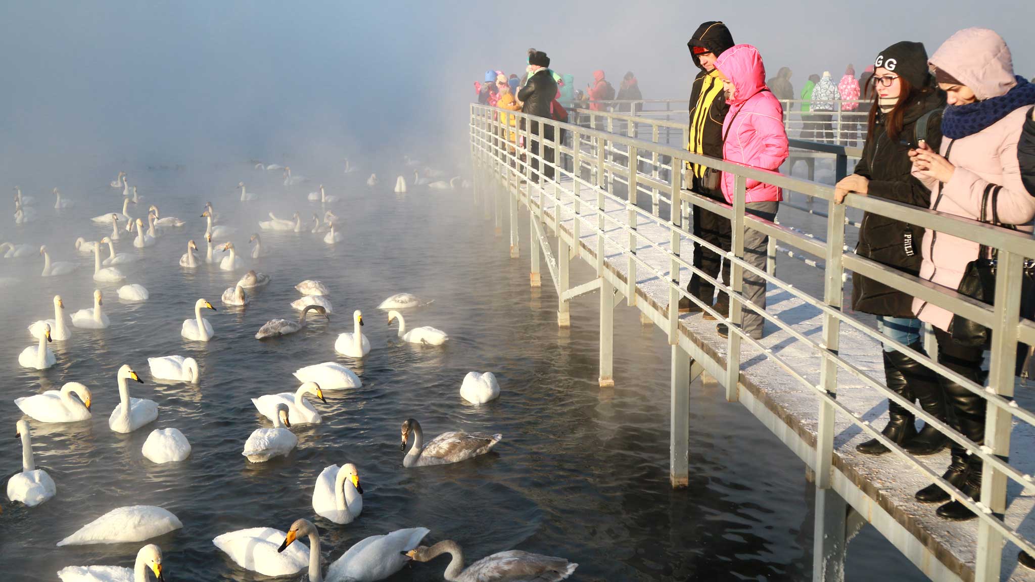 Отдых на Алтае зимой в 2025–2026 году начинается с большого веселого праздника «Алтайская зимовка». Главный пункт программы — посещение незамерзающего озера Светлое, куда каждую зиму прилетают тысячи белых лебедей. В декабре они собираются в большую стаю. Клекот лебедей-кликунов слышно за несколько километров.