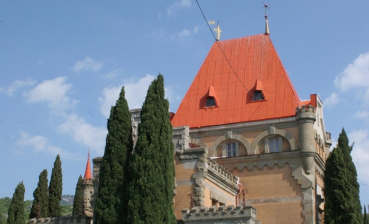 Романтично и немного таинственно выглядит дворец княгини Гагариной в Алуште. Его светлые каменные стены и красная крыша смотрятся ярко на фоне зеленых кипарисов и южного синего неба. А башенки, маленькие оконца-бойницы и фамильный герб князей Гагариных над главным входом делают его похожим на средневековый замок.