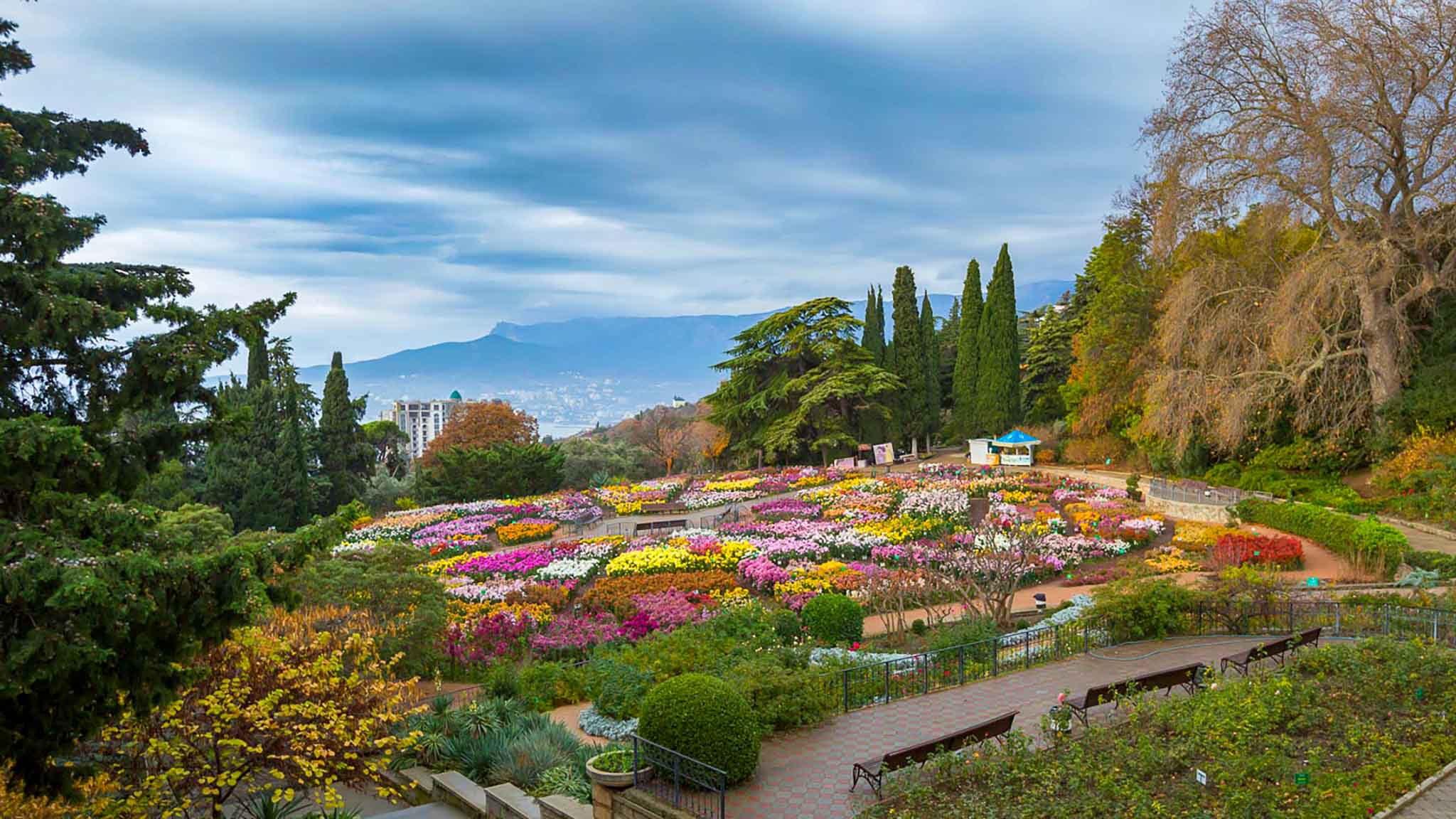 А еще в этом месяце в Никитском ботаническом саду, который находится в получасе езды от Алушты, проходит ежегодный Бал хризантем — тут одновременно распускаются десятки тысяч цветов, и посмотреть на это невероятное зрелище люди съезжаются со всего мира.