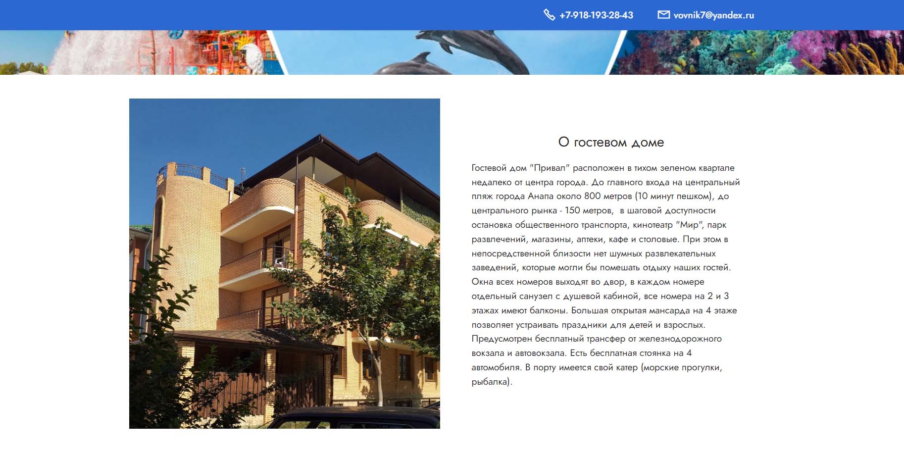 Гостиница была построена 2019 году на берегу Черного моря, в 15 минутах ходьбы от дельфинария и аквапарка. Особенно комфортна она для семейного отдыха. На отельной территории есть бассейн с подогревом с детским отделением, детская площадка и кафе, в котором можно заказать питание. Все номера имеют балконы и собственные ванные комнаты. Рядом расположены аттракционы и овощной рынок.
