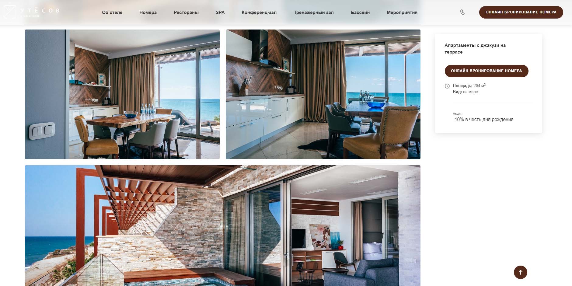 Трехэтажное здание на скале над пляжем имеет современный стеклянный фасад, поэтому из окон пятизвездочного отеля открываются прекрасные виды на побережье и морские просторы. Для отдыхающих работают гриль-бар «Кусто» и ресторан высокой кухни «Националь». В отеле переливной бассейн, высокие потолки и просторные террасы, откуда можно наслаждаться черноморскими закатами.