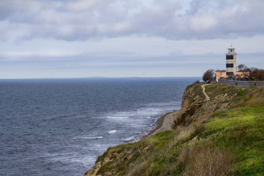 Поздней осенью завораживает картинка штормящего моря. Волны мчат к берегу, будто хотят достать до маяка. Зимой же он сливается с природой. Серо-белое строение и такие же краски вы увидите на склоне: немного снега и проталины.