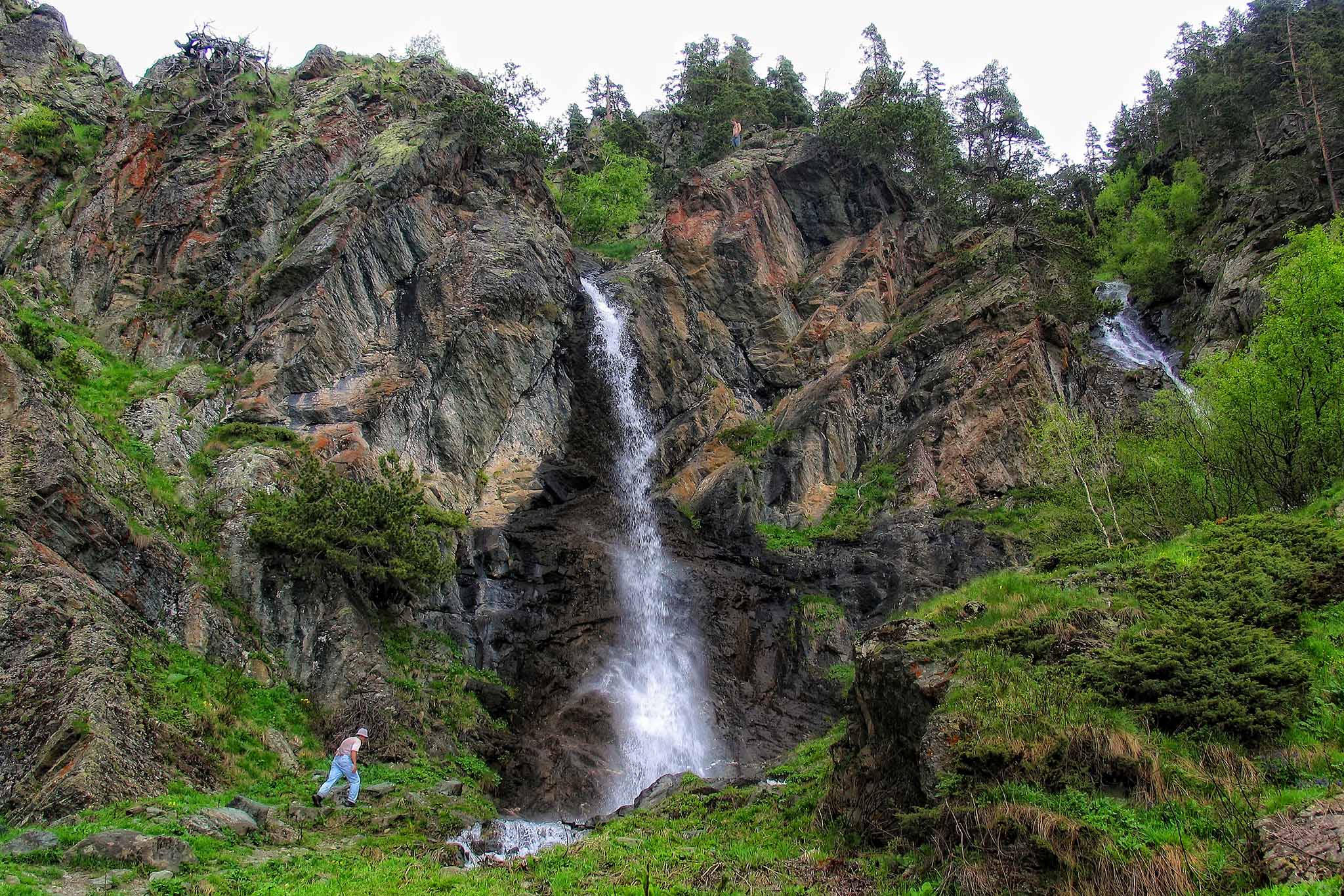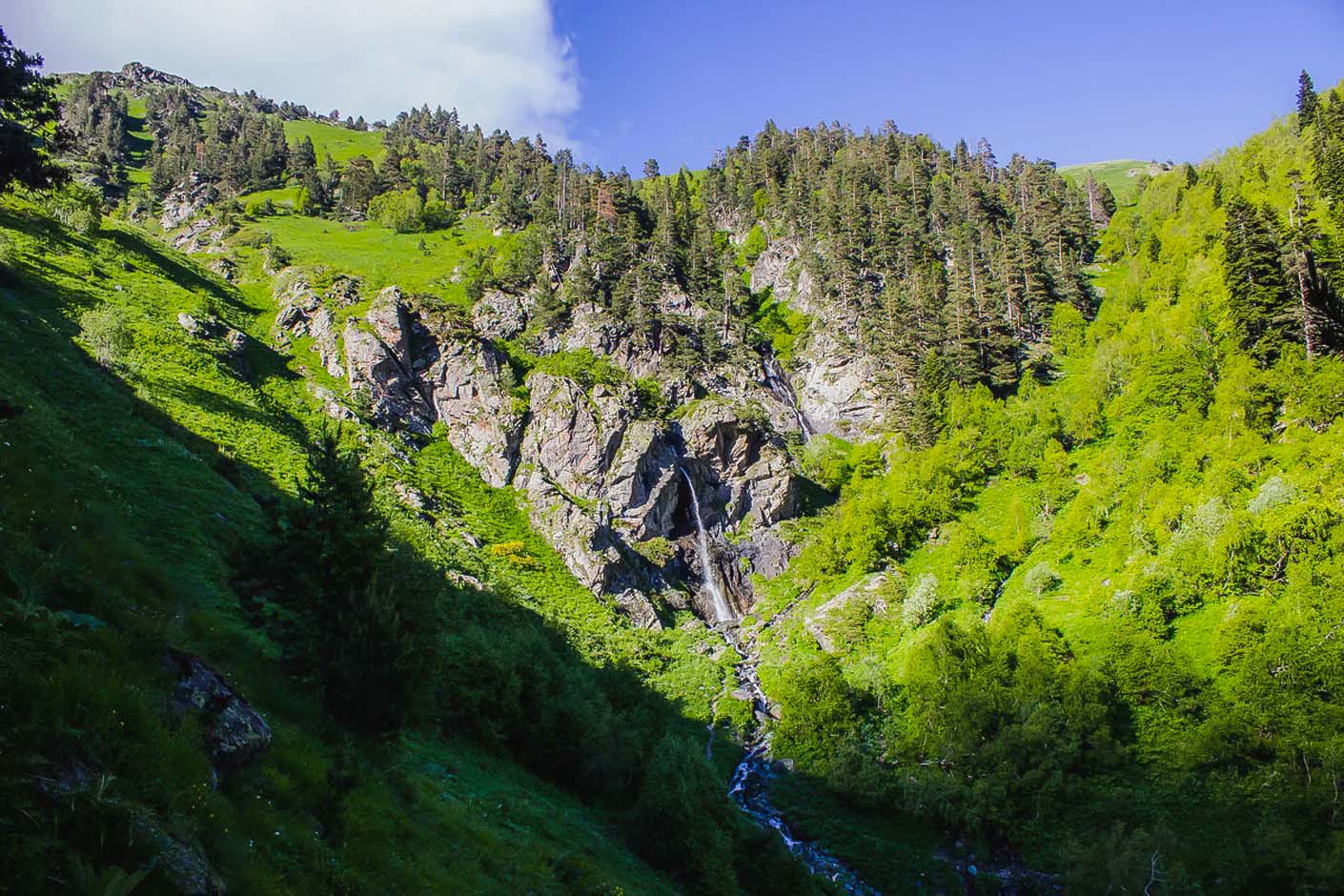 Водопад не отличается бурным потоком или необычным каскадом, а интересен тем, что находится на высоте более 2000 метров буквально на границе леса и зоны альпийских лугов. Отсюда открывается прекрасный вид на Архыз и Кавказские горы.