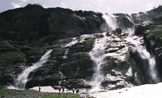 Дальше путь с перевала постепенно спускается к Софийским водопадам, которые поражают своей мощью и величественностью. Дорога к ним лежит по крупным камням, поэтому выберите удобную обувь. Еще не увидев водопады, вы услышите их шум: бурные потоки разбиваются с такой силой, что идущего в метре от вас совсем не слышно. А потом вы окажетесь рядом с водопадами, от которых захватывает дух.