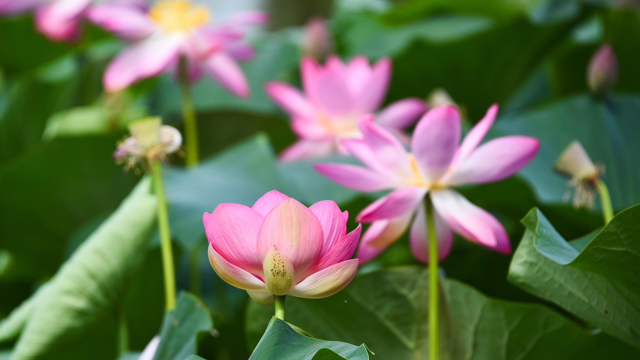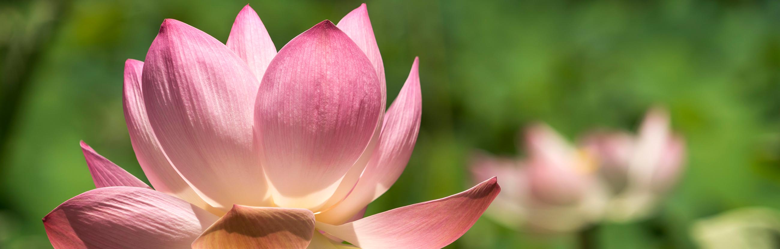 Огромные цветки диаметром 10–20 см в течение дня направлены в сторону солнца. Летом в Астраханской области жарко, поэтому нежные лепестки быстро опадают. Лотосы распускаются всего на 2–3 дня, но из-за большой площади плантаций создается ощущение бесконечного цветения.