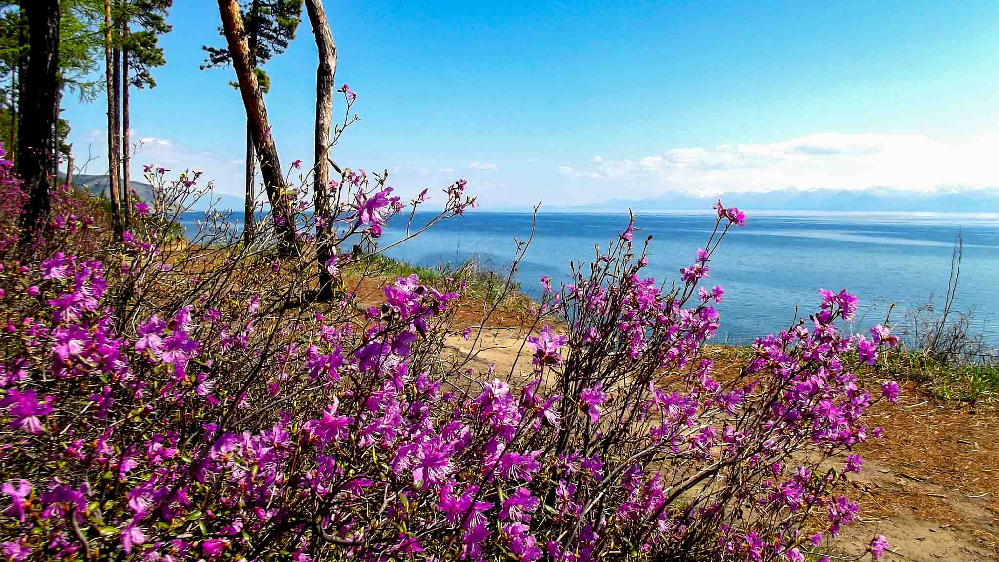 В середине мая на Байкале еще совсем мало травы, но уже вовсю цветет багульник. Его научное название — рододендрон даурский. Да, эти фиолетово-розовые кусты можно увидеть не только на его родине в Забайкалье. Багульник чем-то напоминает японскую сакуру. Красиво. Можно вдоволь им насладиться в районе Малого Моря на иркутской стороне, а также на бурятской, в таких местах как Гремячинск, Турка, Горячинск, бухта Безымянная, Катково и другие. Кстати, многие туркомпании предлагают в это время фототуры — чудесные снимки гарантированы!