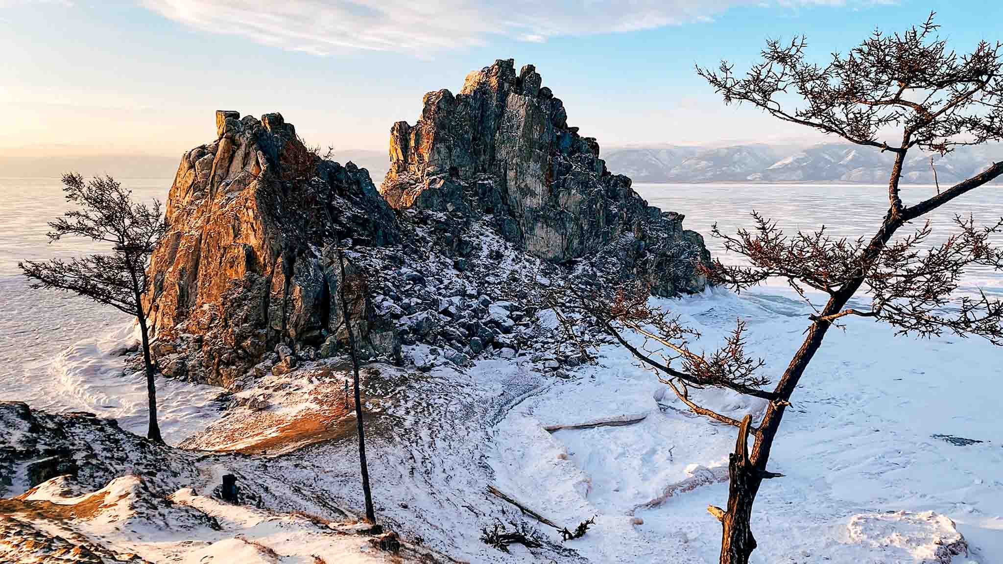 На самом острове можно посмотреть на ледяные гроты. Каких только сосулек там нет! Обычные, мохнатые, словно дождь, снежинками… И больше всего их как раз на Ольхоне — сакральном острове, расположенном в самом центре Байкала, в 250 км от Иркутска. Самое незабываемое сказочное место — это его мыс Хобой, северная точка. Там прибрежные скалы покрываются застывшими волнами — сокуи. Иллюстрации к «Снежной королеве», не иначе!