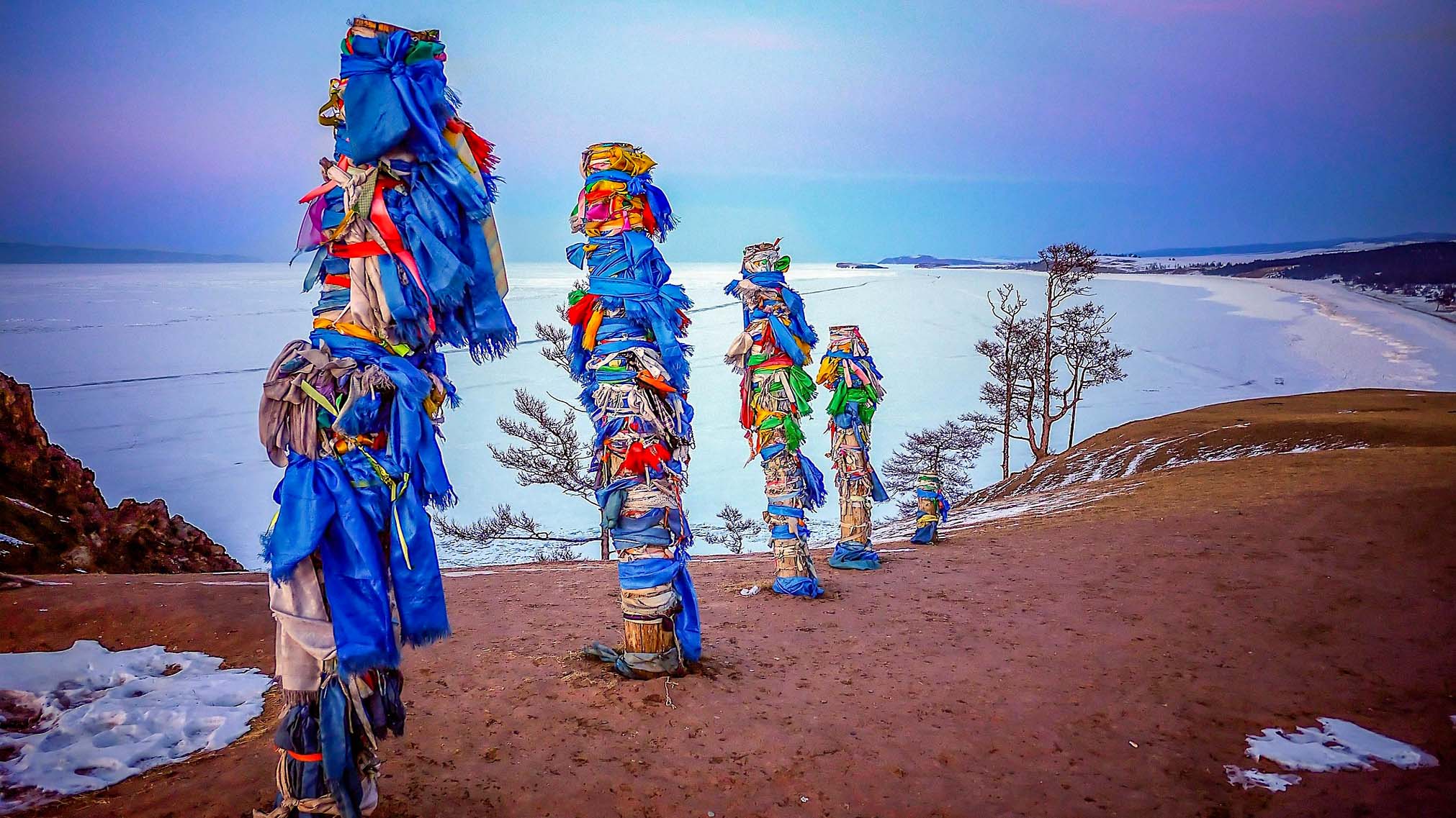 Интересно запечатлеть развевающиеся на ветру ленточки, привязанные к священным столбам-сэргэ, синие просторы Малого моря и изображение дракона на скале.