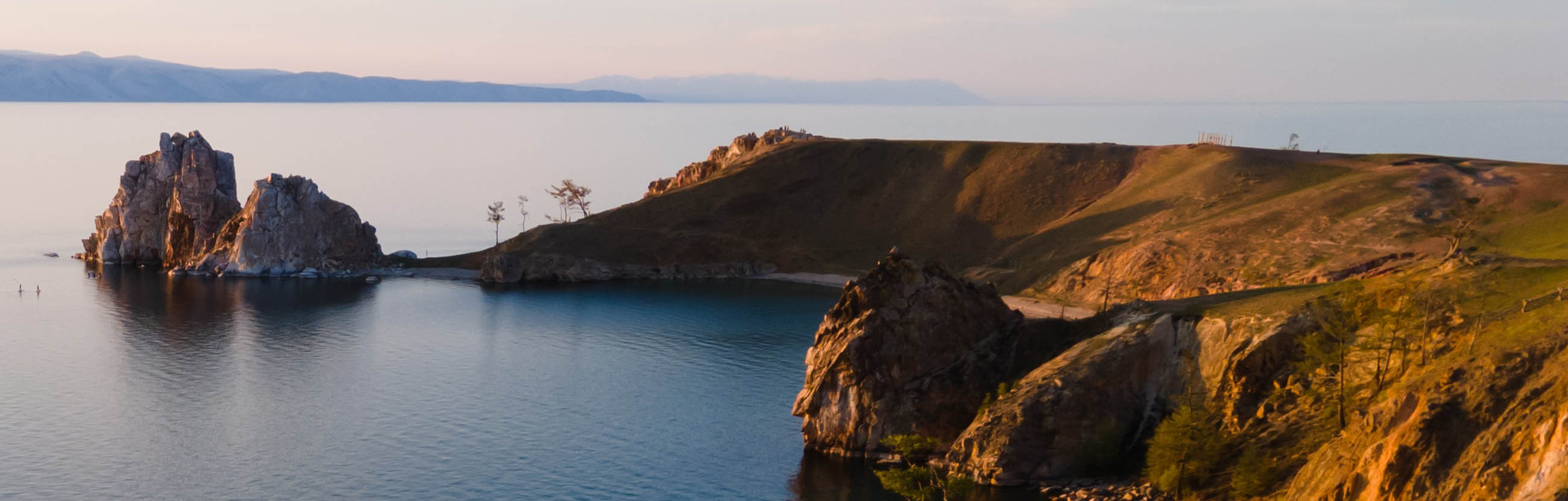 Поверхность мыса покрыта травой и яркими лишайниками. Деревьев нет, поэтому ничто не закрывает обзор на просторы Байкала и гористый западный берег озера.