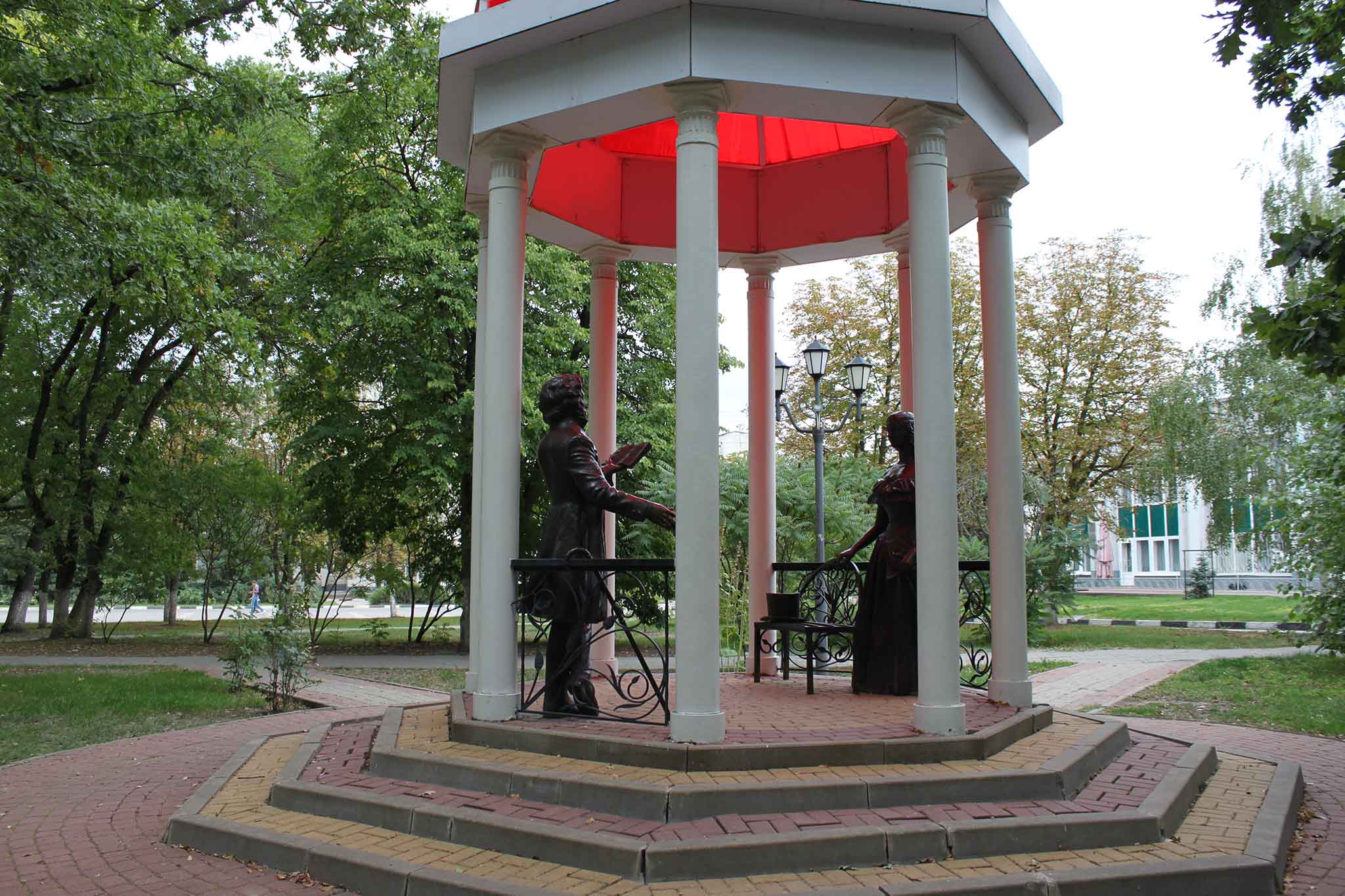 По правую руку от князя Владимира находится небольшая роща — отличное место для прогулок. Здесь есть детский городок, тренажеры, много птиц, часто встречаются белки. Пройдя сквозь аллею вы попадете на территорию университета имени Шухова, где есть еще одна смотровая площадка, которая особенно атмосферна вечером, когда включается подсветка.
