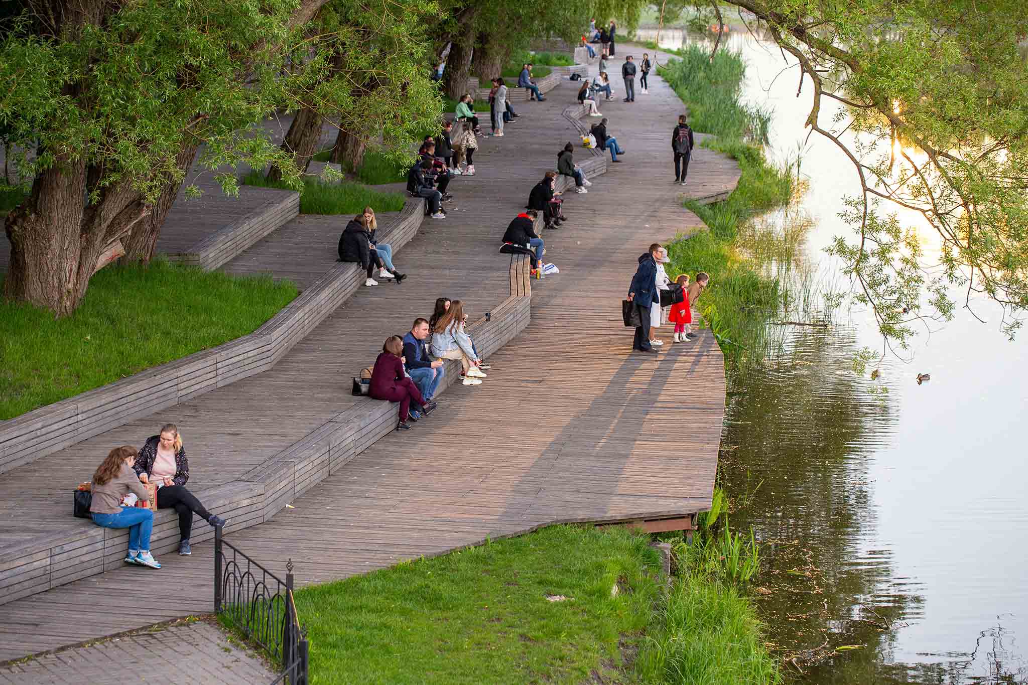 Чистый и уютный парк рядом с рекой. Подходит для пеших прогулок, при этом оборудован велодорожками. Активностей много как на «сухопутной» части территории, так и на водной. Здесь можно устроить фотосессию, покормить уточек, посетить занятие йогой или танцевальный флешмоб.