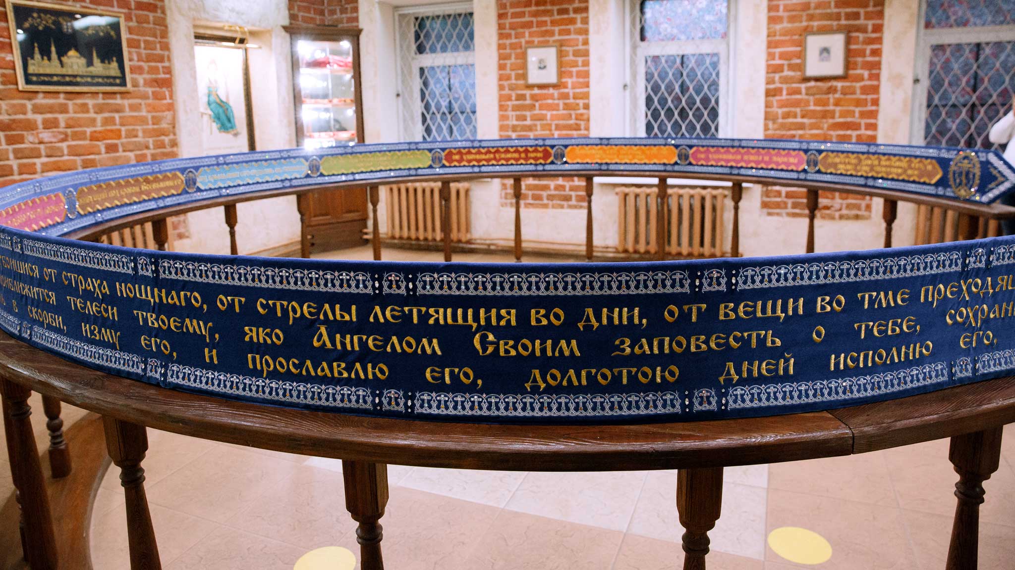 Пояс вышивали 37 золотошвей. Торжок известен как центр золотого шитья. Представляете себе генеральские погоны? Их тоже вышивают здесь. В музее «Торжокские золотошвеи» можно увидеть шитые золотом флаги, платья, мундиры и коллекцию вышитых золотом тюбетеек. Всем приезжающим в гости руководителям местные швеи дарили по тюбетейке. Здесь же висят фотографии: Сталин, Ельцин, Путин, Медведев, все в тюбетейках. Все улыбаются, только Медведев серьезен, будто на него шапку Мономаха надели.