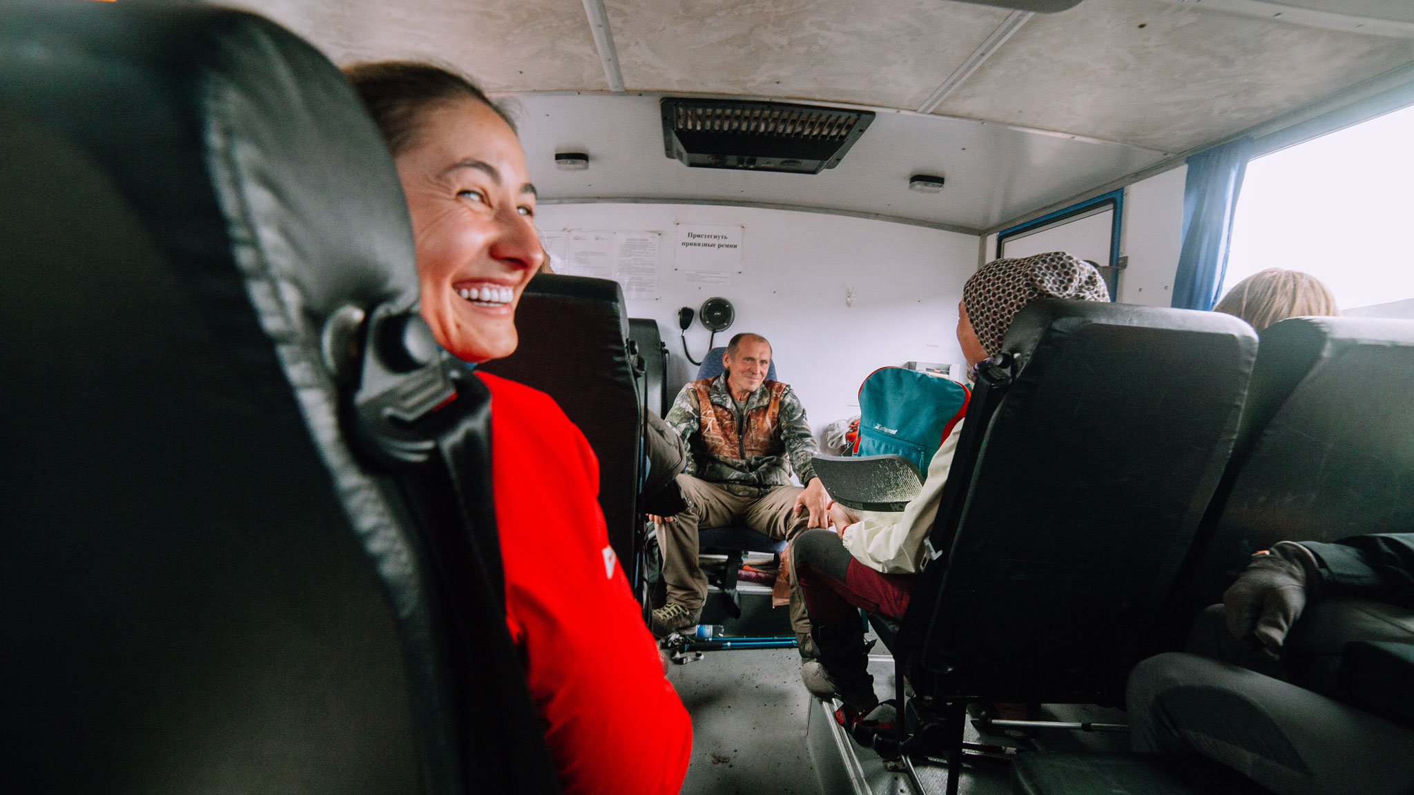 Александр даже во время тряски, как приклеенный, сидит на сиденье лицом к пассажирам и рассказывает о своей жизни. Изредка поворачивается к переговорному устройству и просит водителя притормозить, если за окном заметил медведя.