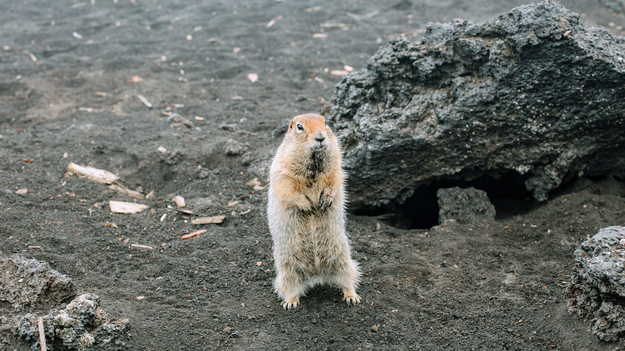 Чтобы туристам было интереснее, на стоянку у Толбачика Александр привез четырех евражек, берингийских сусликов. Они расплодились, бегают повсюду, скребутся у палаток, позируют перед камерой за пару орешков. От этого всем весело.